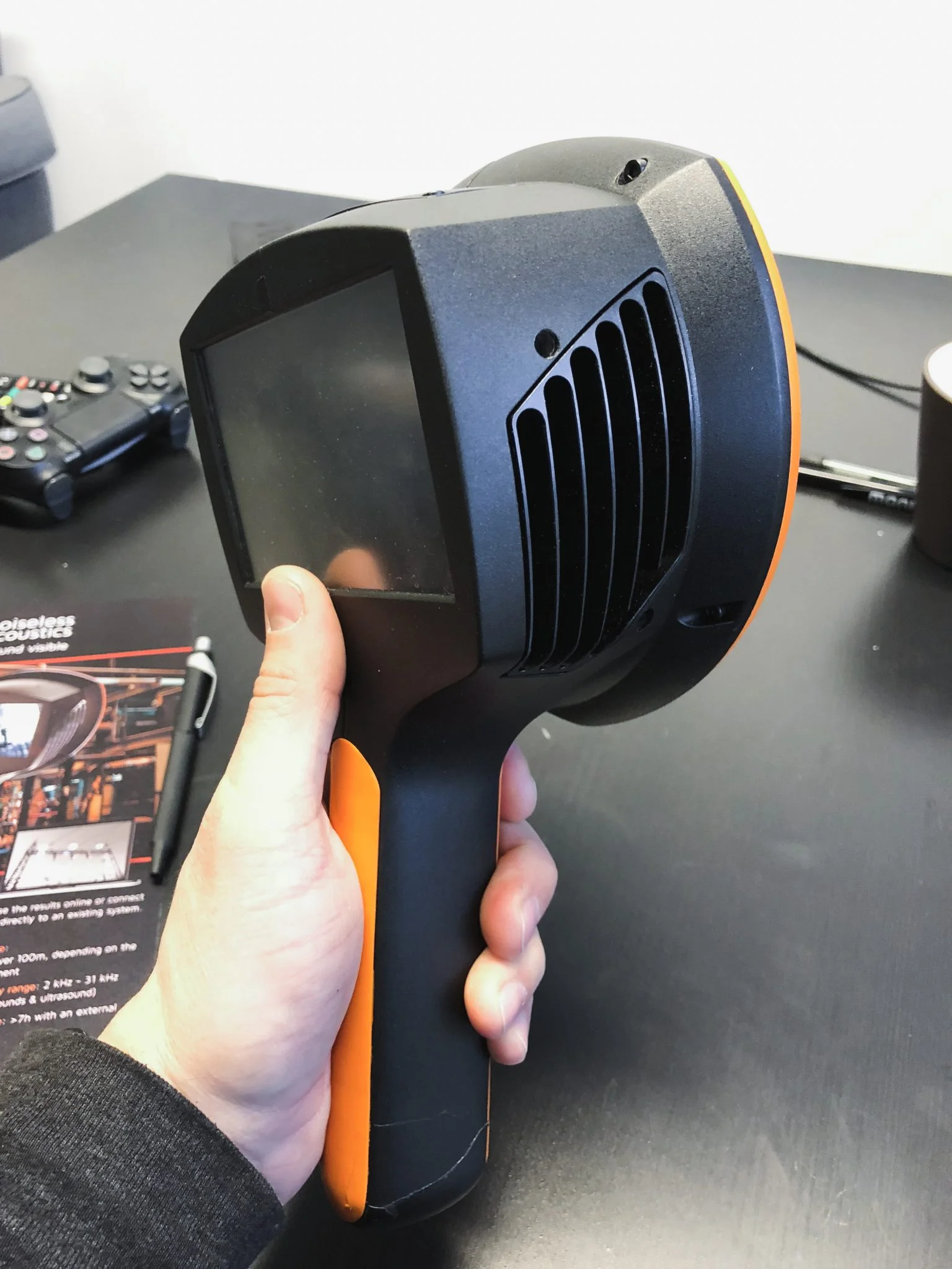 Noiseless Acoustics on suomalainen äänen visualisointiin keskittynyt startup-yritys. Noiseless Acoustics visualisoi ääntä teollisuuden tarpeisiin ja pystyy havaitsemaan esimerkiksi koneiden vikoja pientenkin äänen muutosten perusteella. Loimme yrityksen tuoteidentiteetin ja muotoilimme akustisen kameran. Muotoilun periaatteina olivat laadukas tuote-ergonomia ja selkeä brändin ilmentäminen. Akustisen kameran lisäksi työ sisälsi mikrosensorien muotoilun ja kannettavan laukun pakkausmuotoilun.